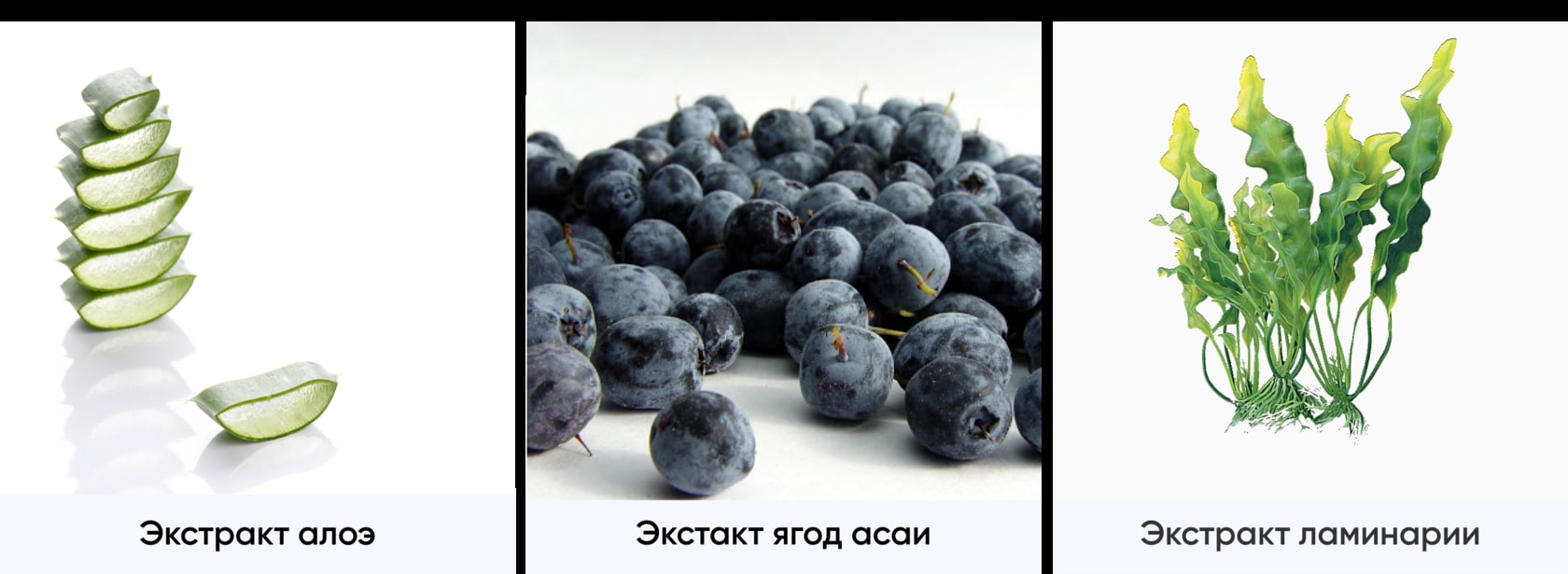 - Содержит экстракт алоэ, асаи и ламинарии для глубокого увлажнения и регенерации кожи