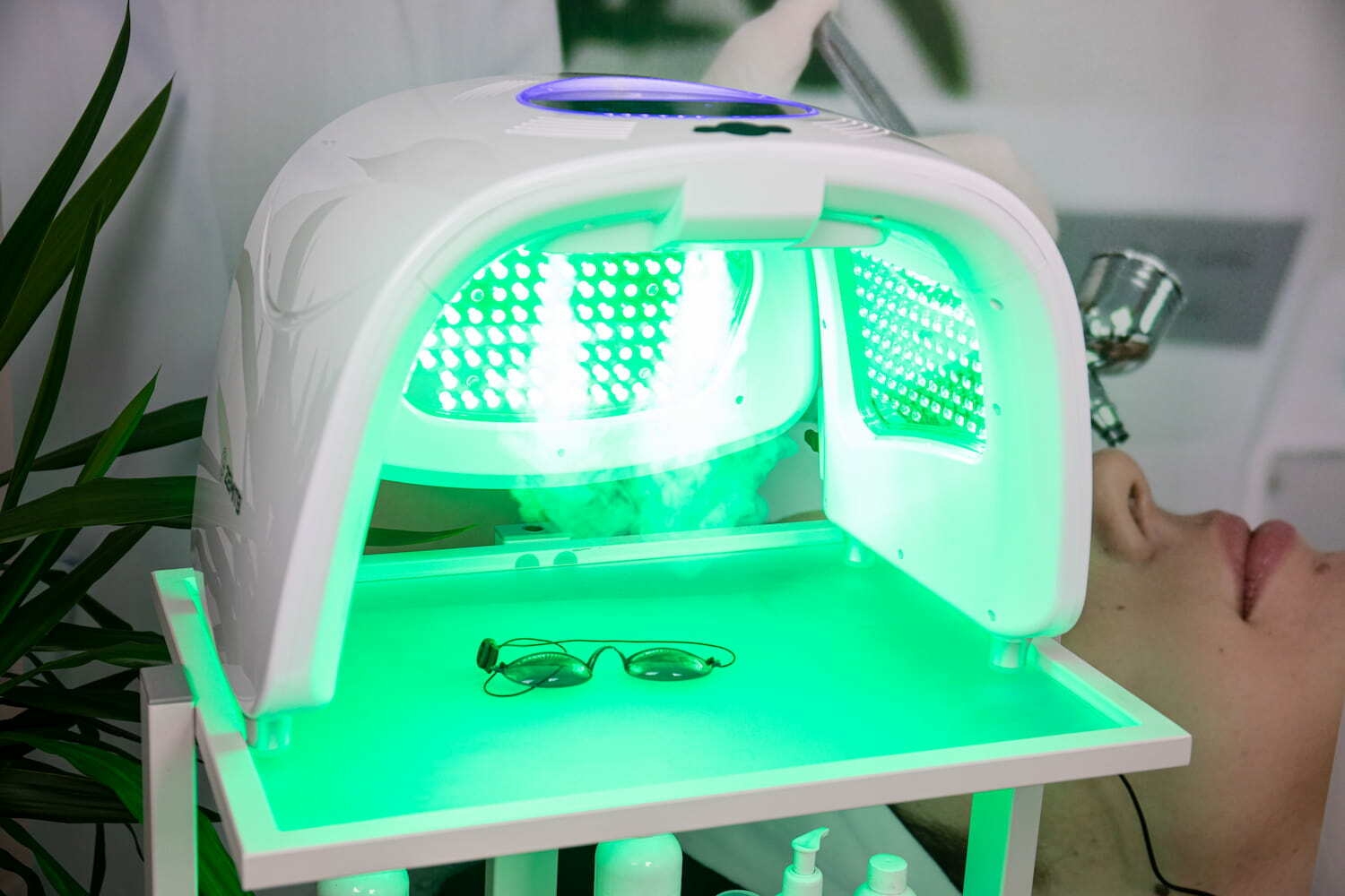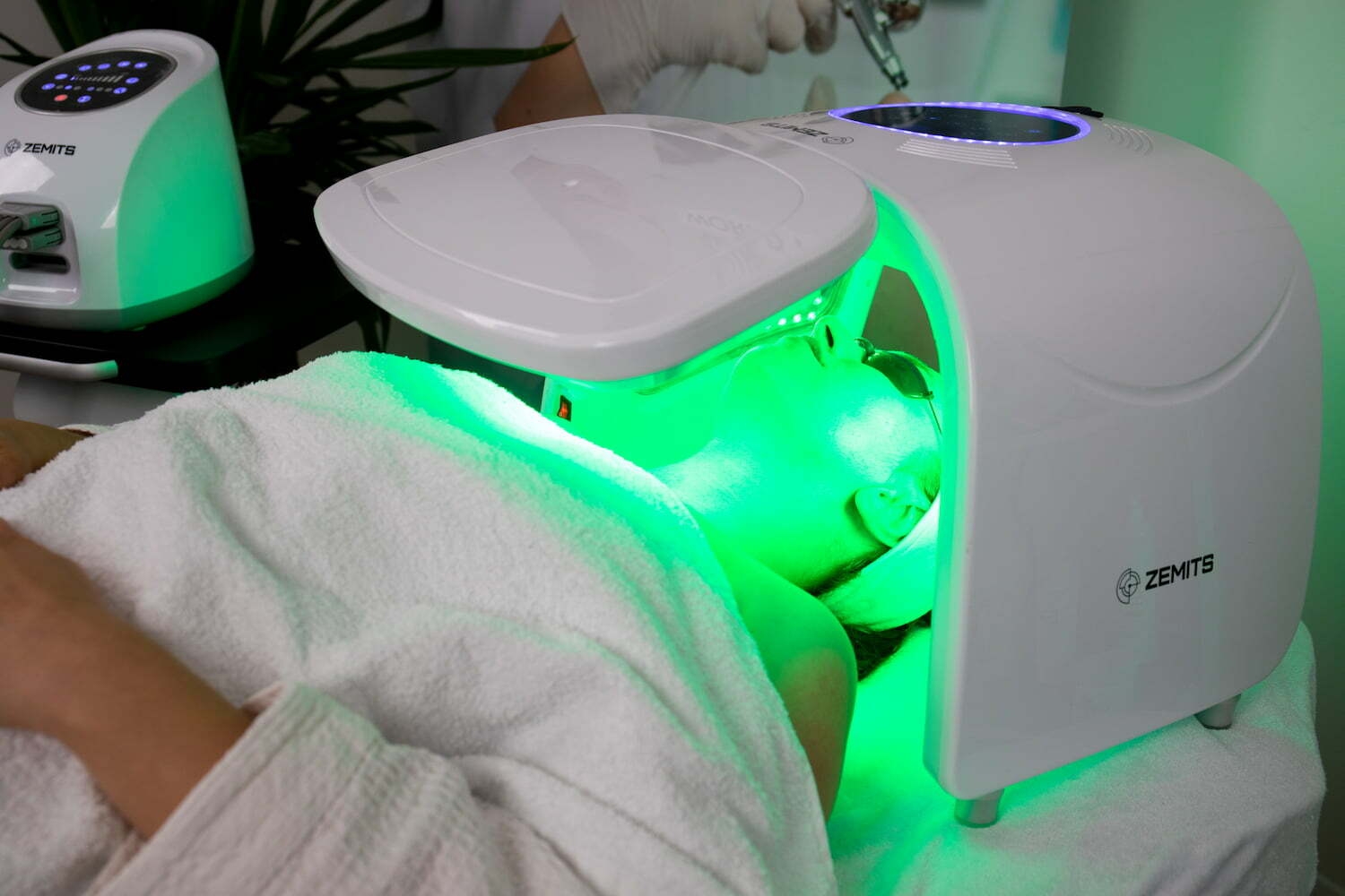 Зеленый – 530 нм. Режим хорошо работает с гиперпигментацией, помогает замедлить выработку меланина. Поскольку зеленый свет поглощается клетками, производящими меланин. Длина волны 530 нм помогает осветлять кожу, выравнивать ее тон.