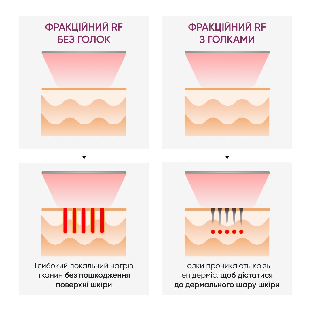 Фракционное RF оказывает влияние на кератиноциты, фибробласты и внеклеточный матрикс, стимулируя ускоренное обновление кожи, сглаживание рубцов, уменьшение морщин и повышение эластичности кожи.