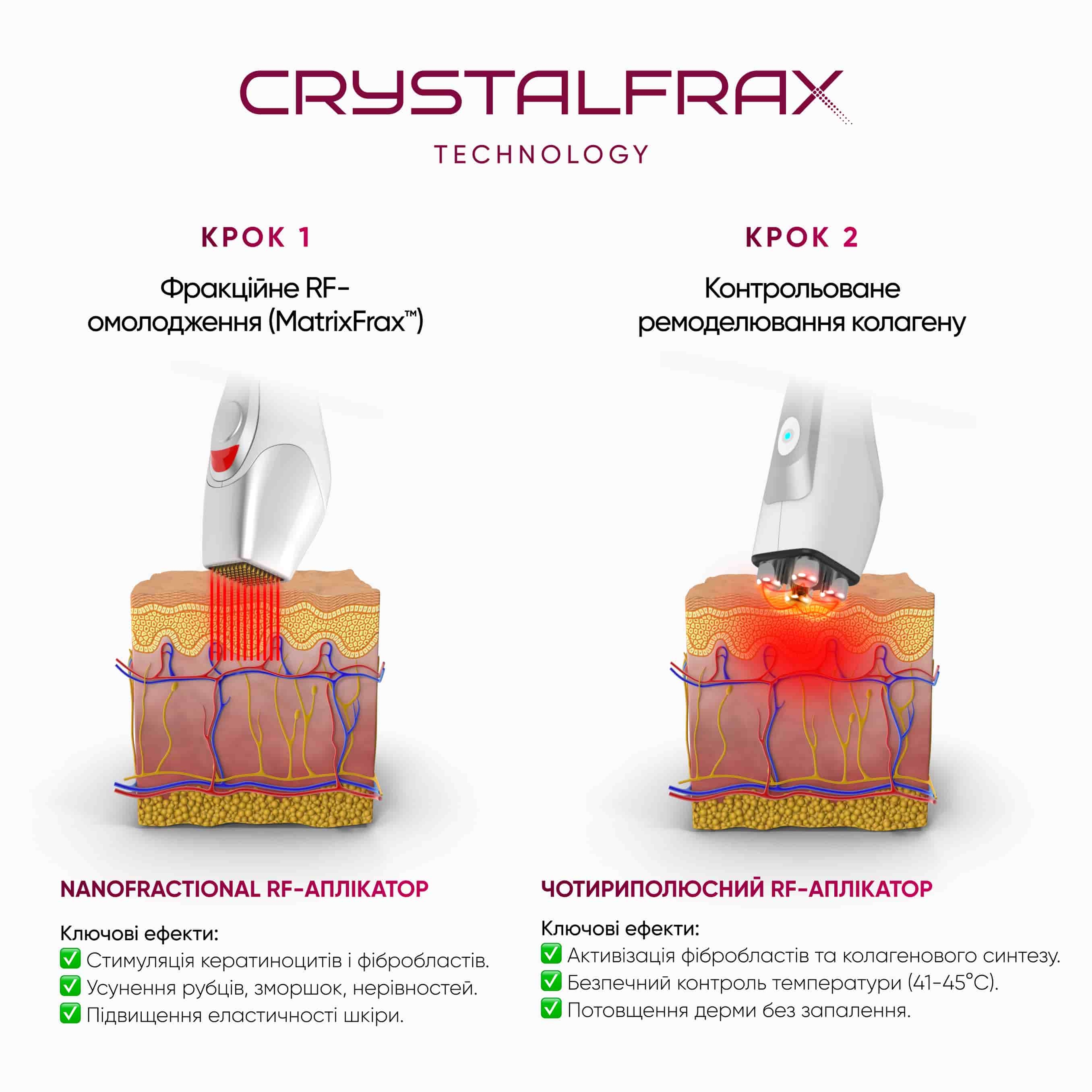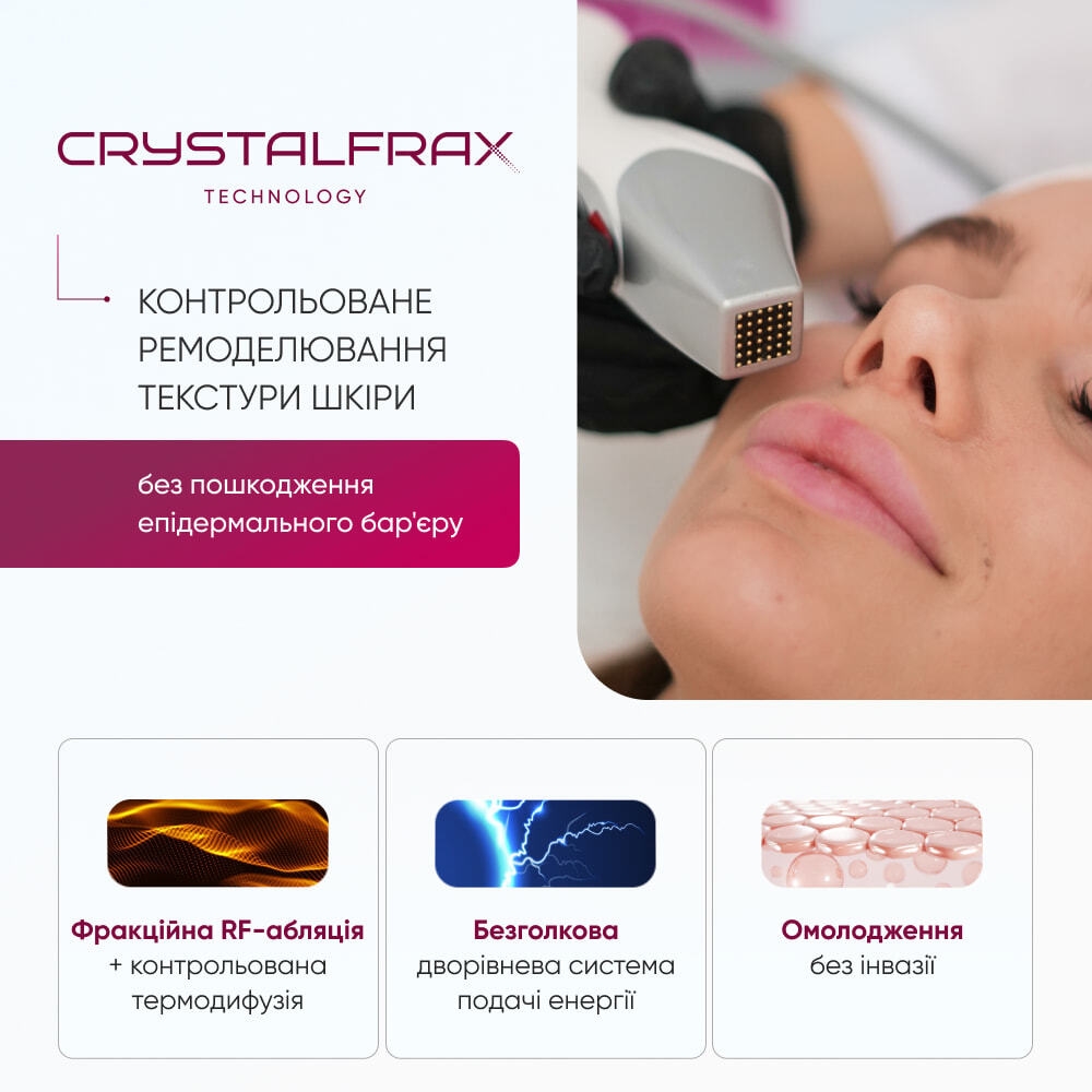 CrystalFrax работает на основе NanoFractional RF-энергии, которая подается в двух этапах, оптимизируя процесс омоложения кожи и стимуляцию коллагена при максимальном контроле температуры для гарантированной эффективности и безопасности.