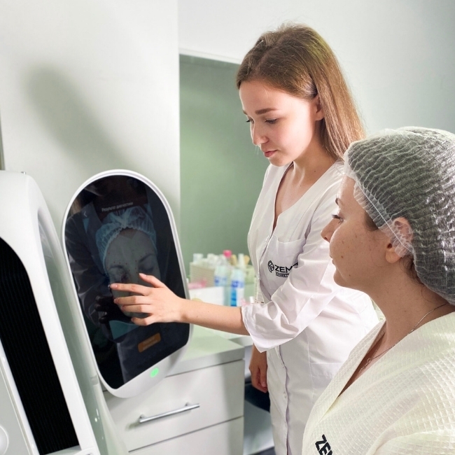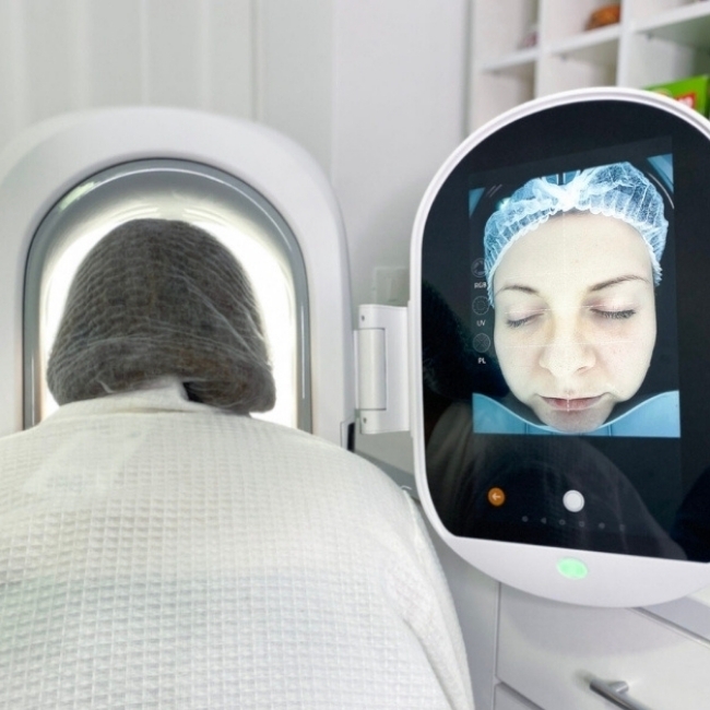 - Стан шкіри оцінюється за 12 факторами від ступеня зволоження до стану текстури шкіри та висипань;