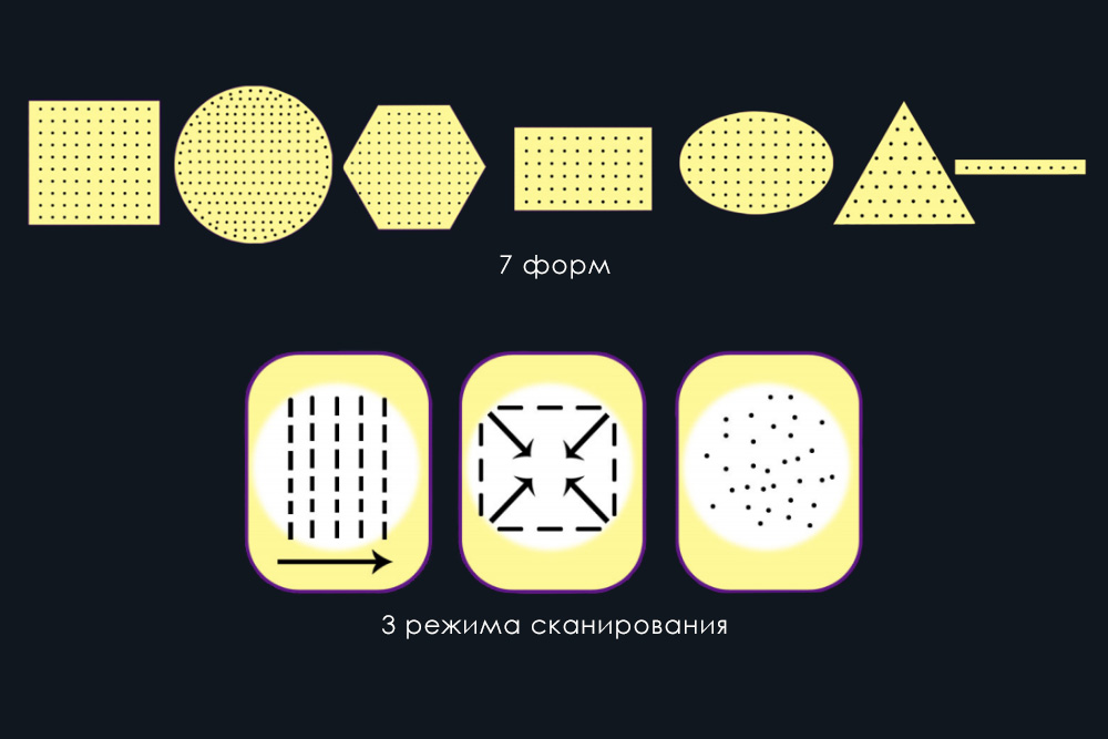 Adonyss CarbonFrax пропонує цілих 7 форм і 3 режими сканування для проведення фракційної лазерної «шліфування» (фракційного фототермоліза) в залежності від області обробки.