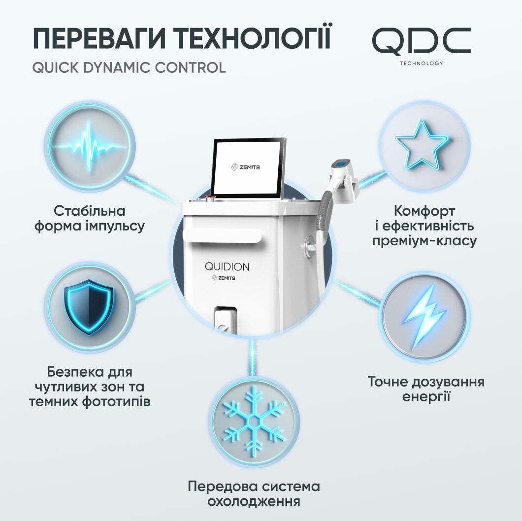 Технологія QDC об’єднує передовий контроль лазерного імпульсу та ефективну систему охолодження, забезпечуючи найвищий рівень безпеки й ефективності процедур. Завдяки точному дозуванню енергії, лазерна дія спрямовується безпосередньо на волосяний фолікул, зменшуючи розсіювання та покращуючи результати. Унікальна здатність підтримувати стабільну форму імпульсу запобігає утворенню гарячих точок, що дозволяє знизити ризик теплового пошкодження навколишніх тканин.