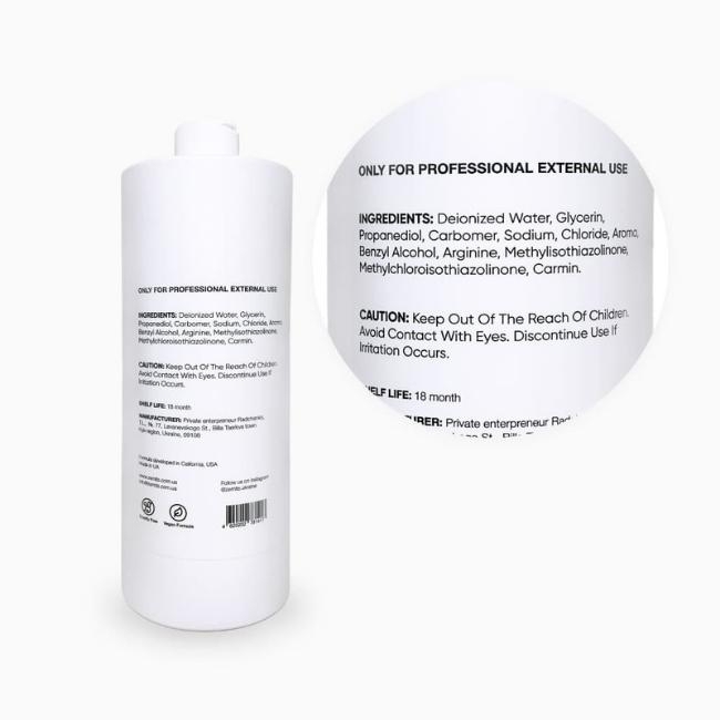 Деіонізована вода, Гліцерин, Пропанедіол, Карбомер, Хлористий натрій, Ароматизатор, Бензиловий спирт, Аргінін, Метилізотіазолінон, Метилхлорізотіазолінон, Кармін