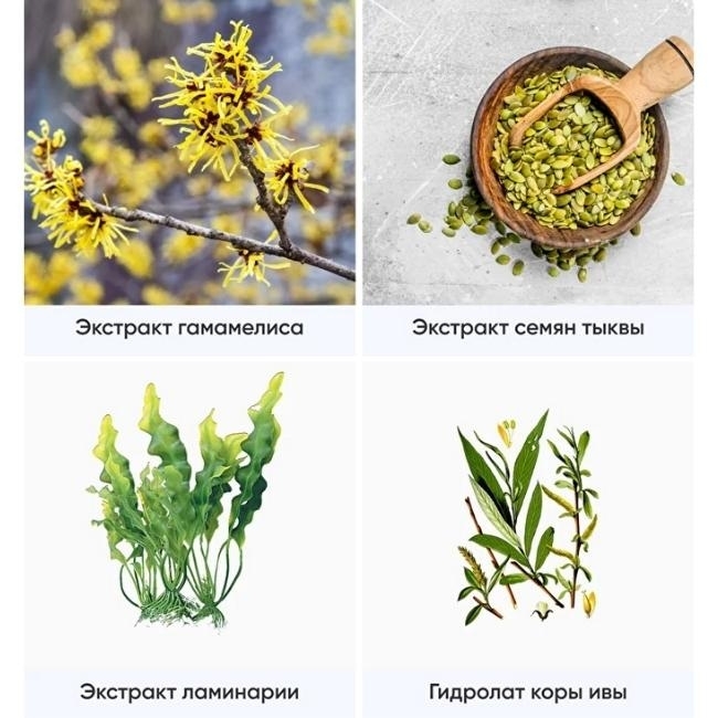 ⭐️ Містить гідролат кори верби, екстракти насіння гарбуза, гамамелісу, ламінарії, чорного горіха