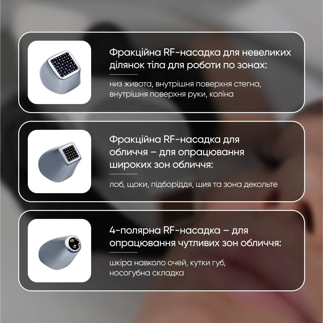 Фракційне RF впливає на кератиноцити, фібробласти та позаклітинний матрикс, стимулюючи прискорене оновлення шкіри, згладжування рубців, зменшення зморшок та підвищення еластичності шкіри.