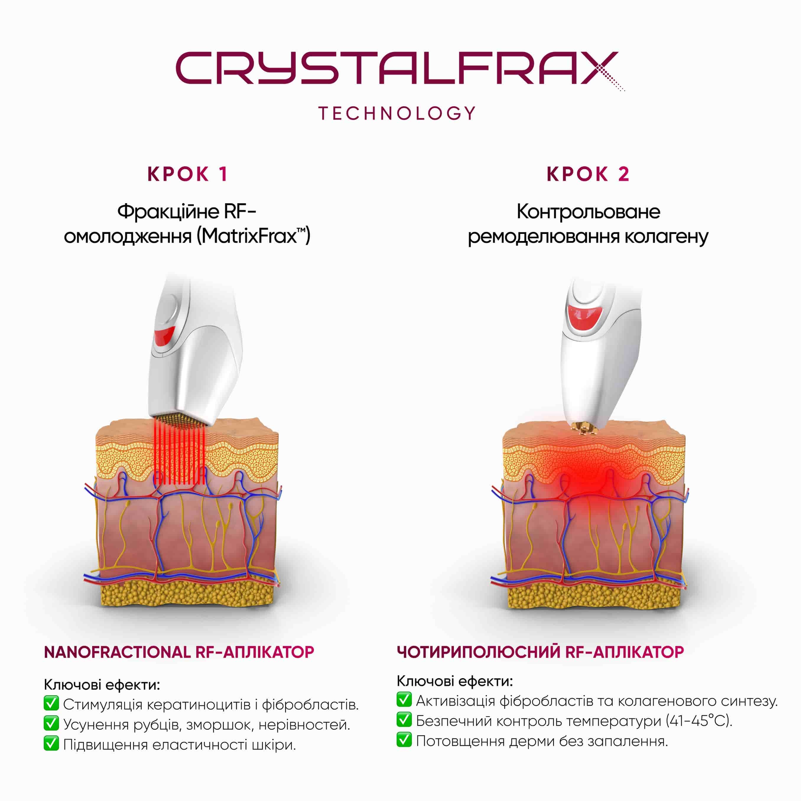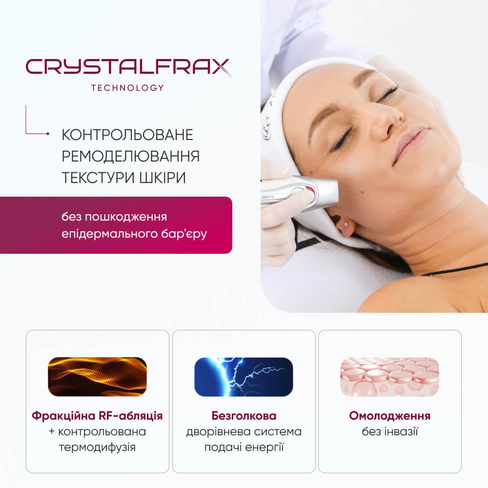 CrystalFrax працює на основі NanoFractional RF-енергії, яка подається в двох етапах, оптимізуючи процес омолодження шкіри та стимуляцію колагену при максимальному контролі температури для гарантованої ефективності та безпеки.